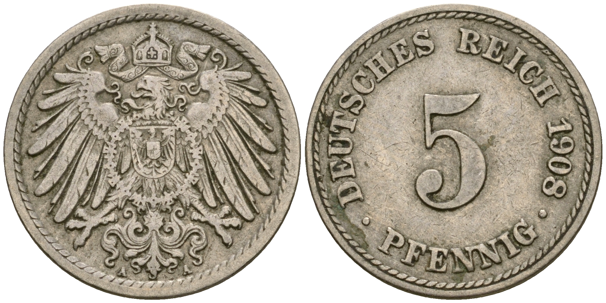 Германия 5 пфеннигов 1908 A KM 11, Jager 12, Weege 6 медно-никель 4364-4555