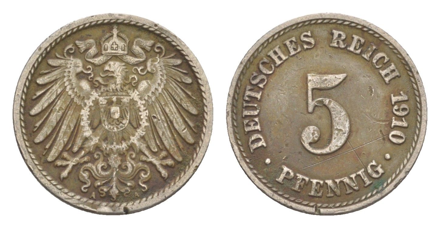 Германия 5 пфеннигов 1910 A, Вильгельм II (1888-1918) KM 11, J. 12 медно-никель 4647-865
