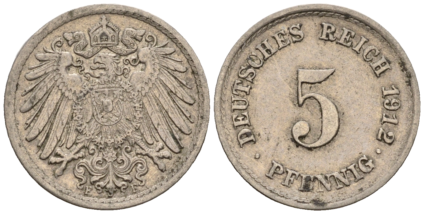 ГЕРМАНИЯ 5 ПФЕННИГОВ 1912 F, KM 11, J. 12 медно-никель 53-1356