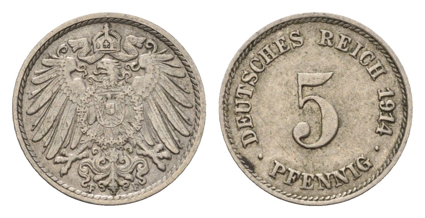 Германия 5 пфеннигов 1914 F, Вильгельм II (1888-1918) KM 11, J. 12 медно-никель 4636-314
