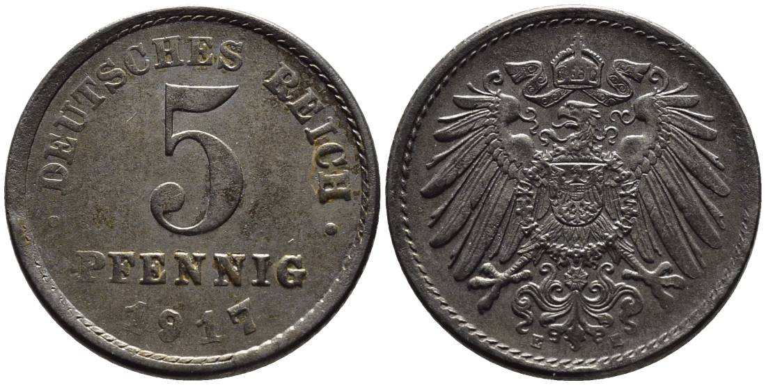 ГЕРМАНИЯ 5 ПФЕННИГОВ 1917 E KM 19, Jager 297, Weege 5 железо 4547-564