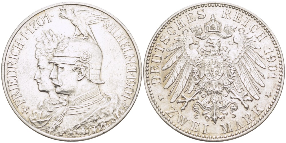 Пруссия 2 марки 1901 A, 200 лет Прусской королевской династии (Фридрих I - Вильгельм II) J.105, Weege 105, KM 525 серебро PROOF 00-816-69