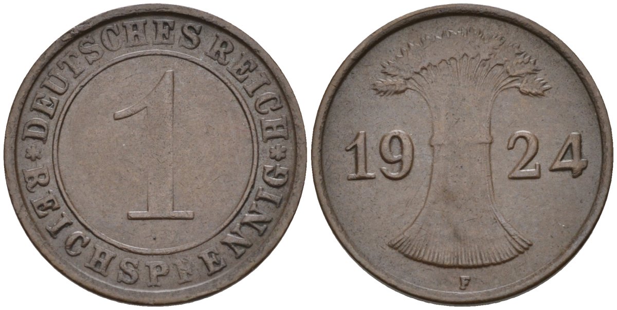 Германия 1 рейхспфенниг 1924 F KM 37, J.313, Weege 2 медь 4585-551