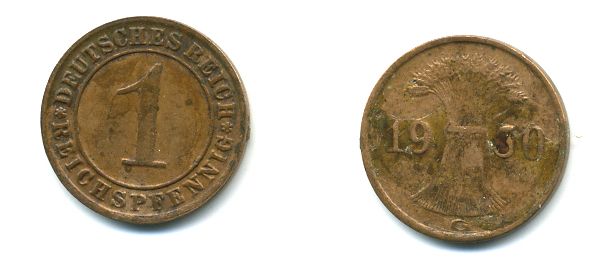 ГЕРМАНИЯ 1 РЕЙХСПФЕННИГ 1930 G KM 37, J. 313 бронза 46-927