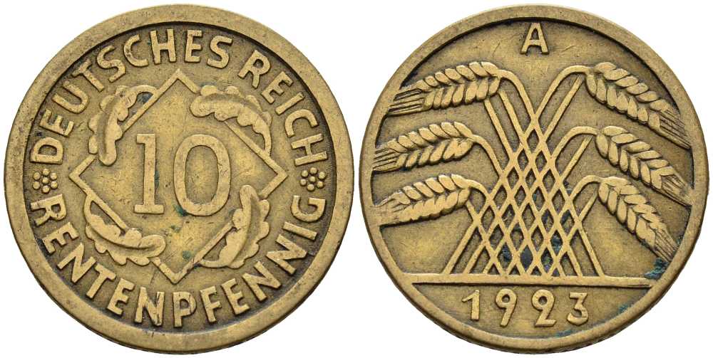 ГЕРМАНИЯ 10 РЕНТЕНПФЕННИГОВ 1923 А KM 33, J. 309 алюминиевая бронза 4401-343