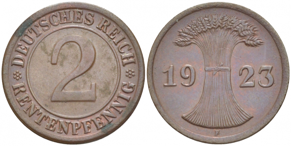 ГЕРМАНИЯ 2 РЕНТЕНПФЕННИГА 1923 F KM 31, J. 307 бронза 4532-537