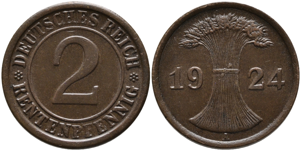 ГЕРМАНИЯ 2 РЕНТЕНПФЕННИГА 1924 А KM 31, J.307 бронза 96-613