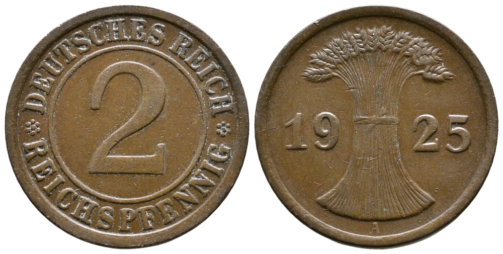 ГЕРМАНИЯ 2 РЕЙХСПФЕННИГА 1925 A KM 38, J. 314 бронза 176-343