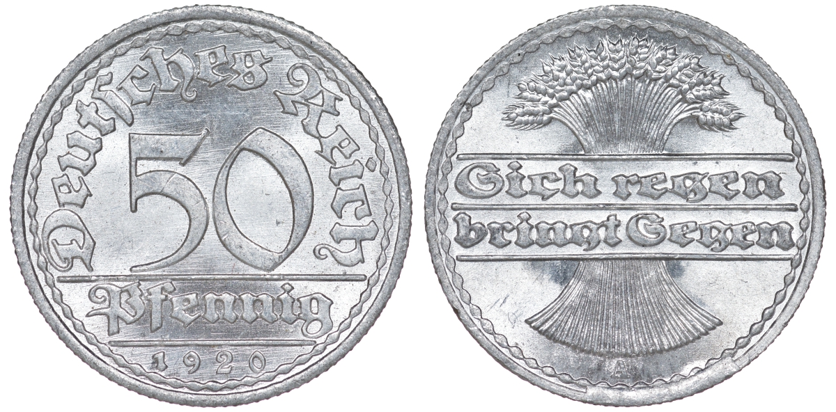 Германия 50 пфеннигов 1920 A KM 27, J. 301 алюминий aUNC 4163-626