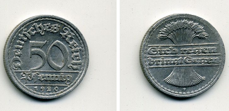 ГЕРМАНИЯ 50 ПФЕННИГОВ 1920 F KM 27, J. 301 алюминий 41-753