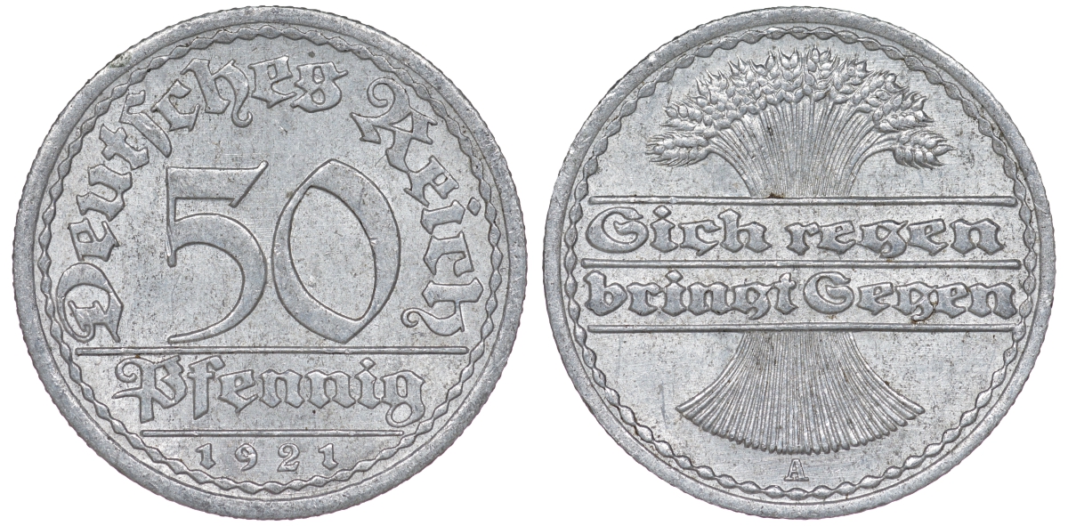 Германия 50 пфеннигов 1921 A KM 27, J. 301 алюминий 4114-421
