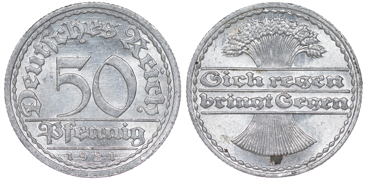 Германия 50 пфеннигов 1921 A KM 27, J. 301 алюминий aUNC 4114-555