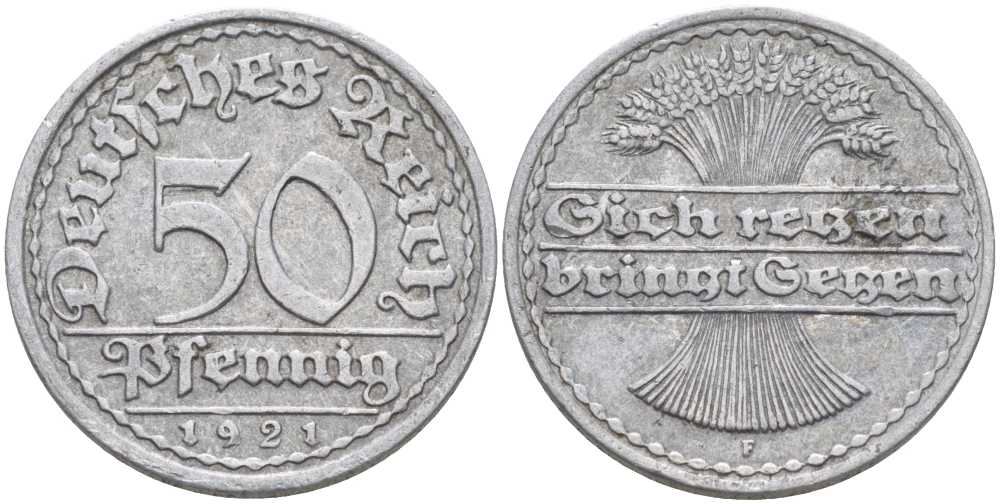 ГЕРМАНИЯ 50 ПФЕННИГОВ 1921 F KM 27, J. 301, Weege 10 алюминий 175-135