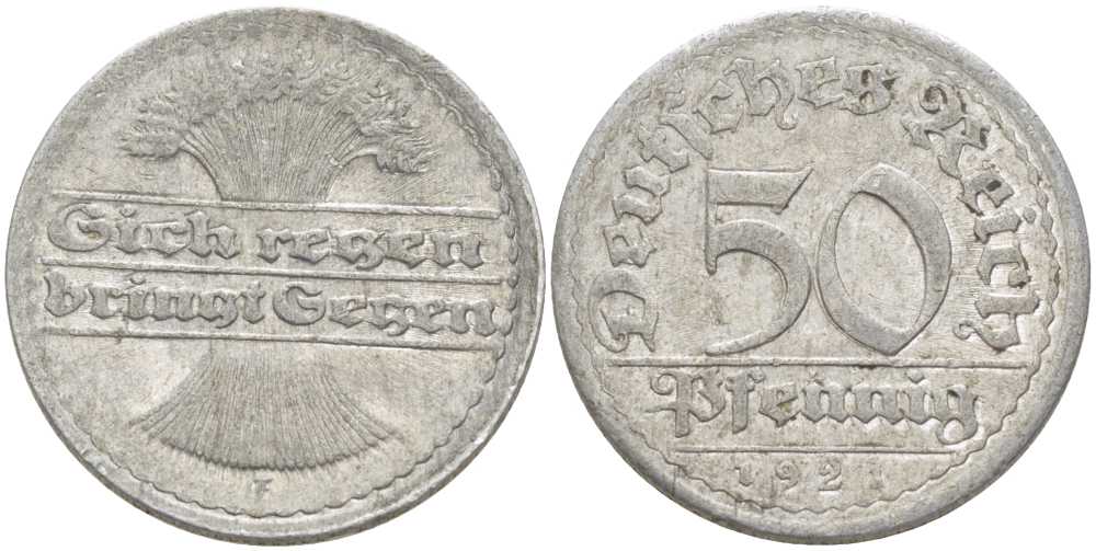 ГЕРМАНИЯ 50 ПФЕННИГОВ 1921 G KM 27, J. 301, Weege 10 алюминий 261-342