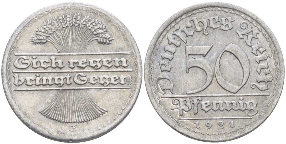 ГЕРМАНИЯ 50 ПФЕННИГОВ 1921 G KM 27, J. 301, Weege 10 алюминий 261-734