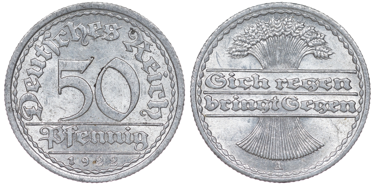 Германия 50 пфеннигов 1922 A KM 27, J. 301 алюминий aUNC 4114-1136