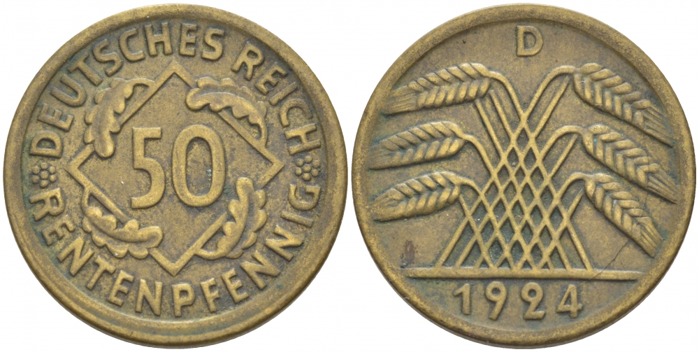 Германия 50 рентенпфеннигов 1924 D KM 34, J. 310 алюминиевая бронза 4127-311