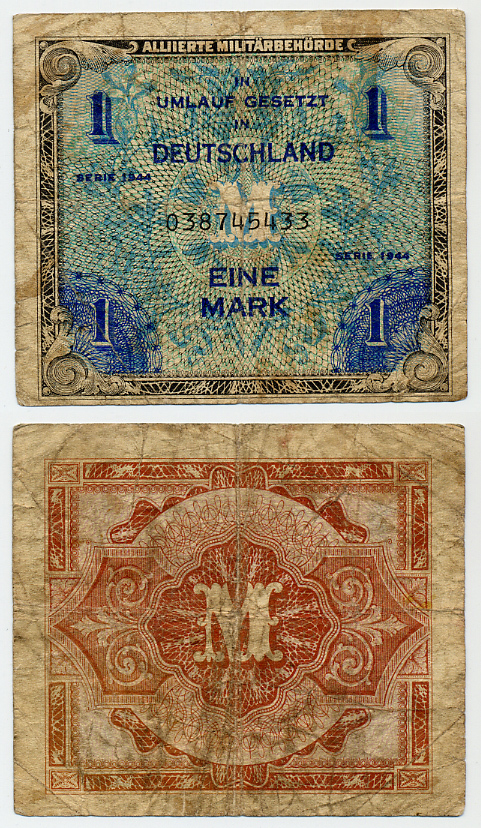 ГЕРМАНИЯ 1 МАРКА 1944 ОККУПАЦИЯ ГЕРМАНИИ СОЮЗНЫМИ ВОЙСКАМИ, ВТОРАЯ МИРОВАЯ ВОЙНА, 9 ЦИФРВ НОМЕРЕ, БЕЗ F Pick 192b бумага 6294-32-2