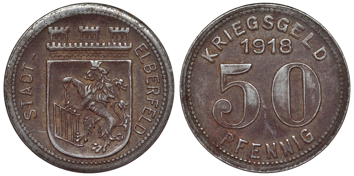 Германия, округ Эльберфельд 50 пфеннигов 1917 Вупперталь, Северный Рейн-Вестфалия, нотгельд железо 4119-1253
