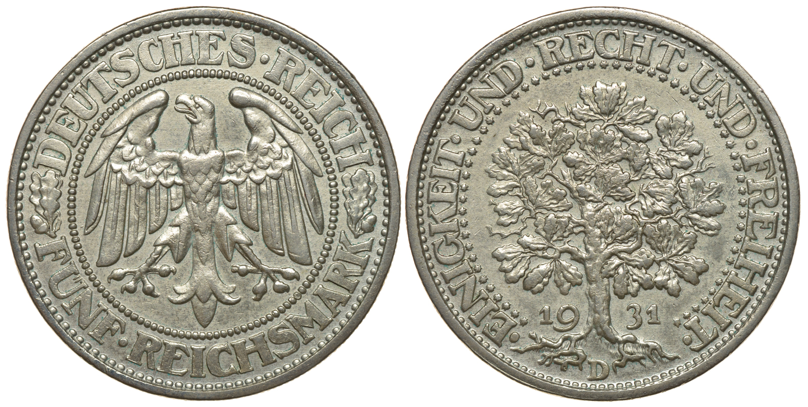 ГЕРМАНИЯ 5 МАРОК 1931 D - ДУБ, цена по каталогу МТ 300 евро J. 331, KM 56 серебро aUNC 00-128-33