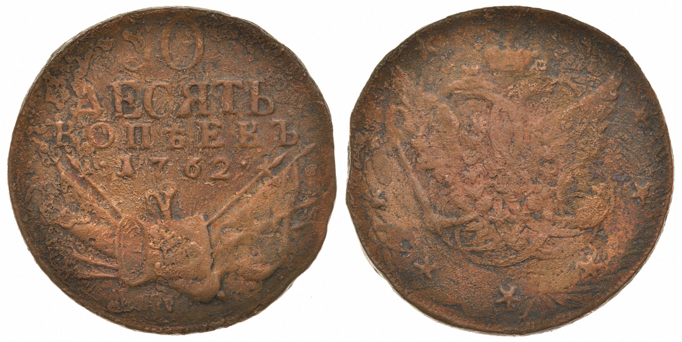 РОССИЯ 10 КОПЕЕК 1762 ВОЕННАЯ АРМАТУРА Биткин 14 R медь 10-009-61