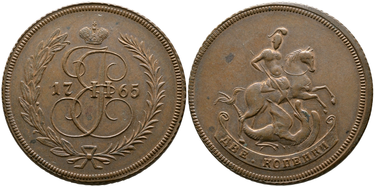 Россия 2 копейки 1765 ЕМ, Екатерина II (1762-1796), новодел Биткин 690 R2 медь UNC 10-002-16