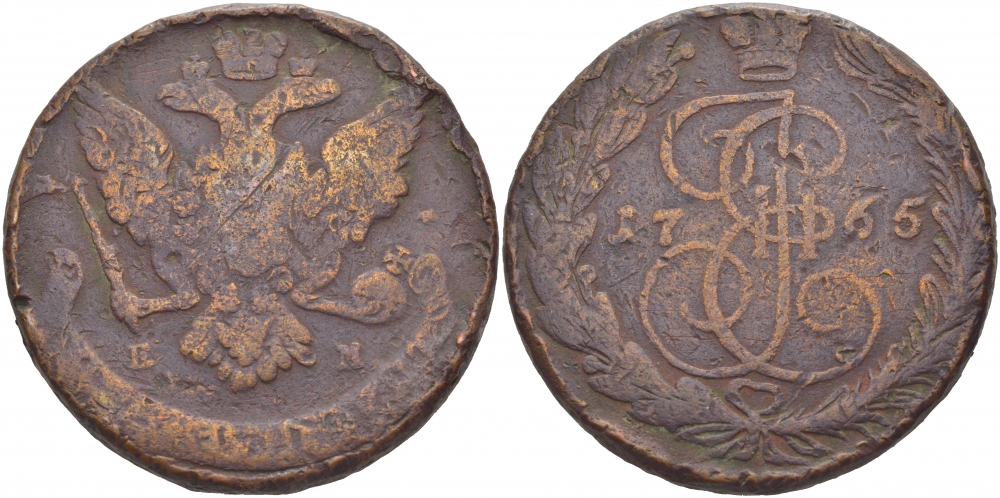 Россия 5 копеек 1765 ЕМ, Екатерина II (1762-1796) Биткин 611 медь 1103-7-61