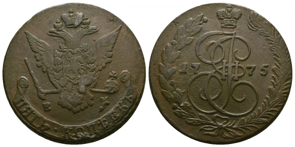 Россия 5 копеек 1775 ЕМ, Екатерина II (1762-1796) Биткин 624 медь 1103-6-14
