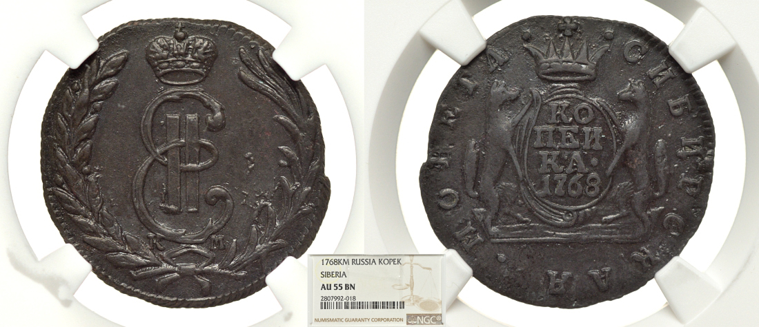 Россия, Сибирские монеты 1 копейка 1768 КМ, в слабе NGC AU 55 BN Биткин 1136 медь 15-004-13