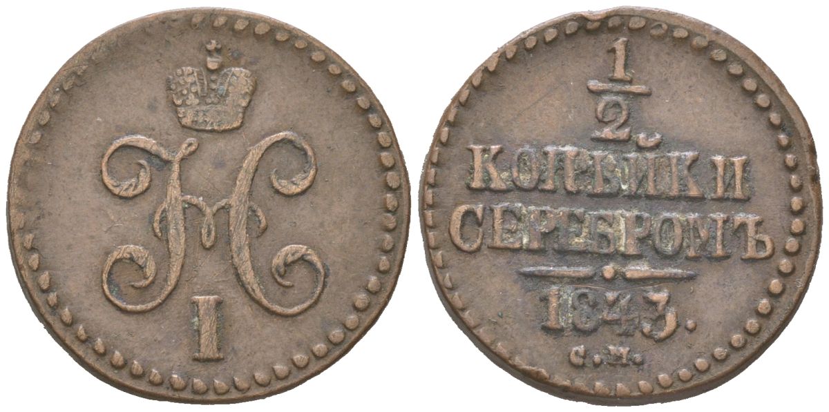 Россия 1/2 копейки 1843 СМ, Николай I (1825-1855) Биткин 781 медь 4613-236