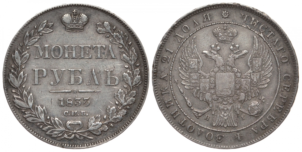 Россия 1 рубль 1833 СПБ-НГ, Николай I (1825-1855) Биткин 160, КМ 168.1 серебро 00-802-48
