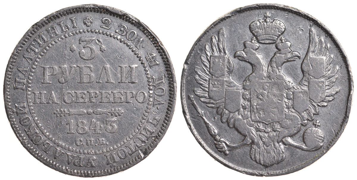Россия 3 рубля 1843 СПБ Биткин 89 R платина 00-000-00
