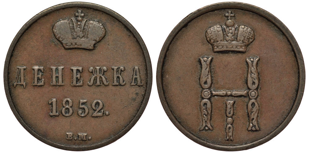 Россия денежка 1852 ВМ, Николай I (1825-1855) Варшавский монетный двор KM 148.3, Биткин 874 медь 00-818-46