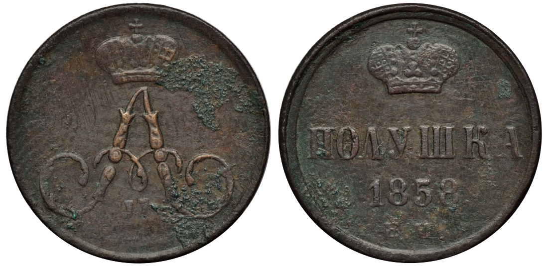 Россия полушка 1858 ЕМ, Александр II (1855-1881) Биткин 380 медь 219-955