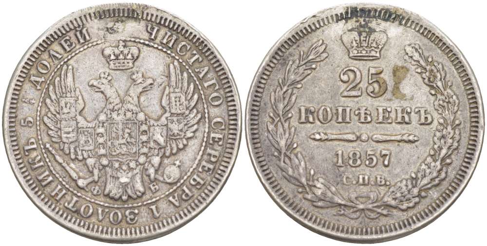 Россия 25 копеек 1857 СПБ-ФБ, Александр II (1855-1881) Биткин 55, KM 166.1 серебро 00-00