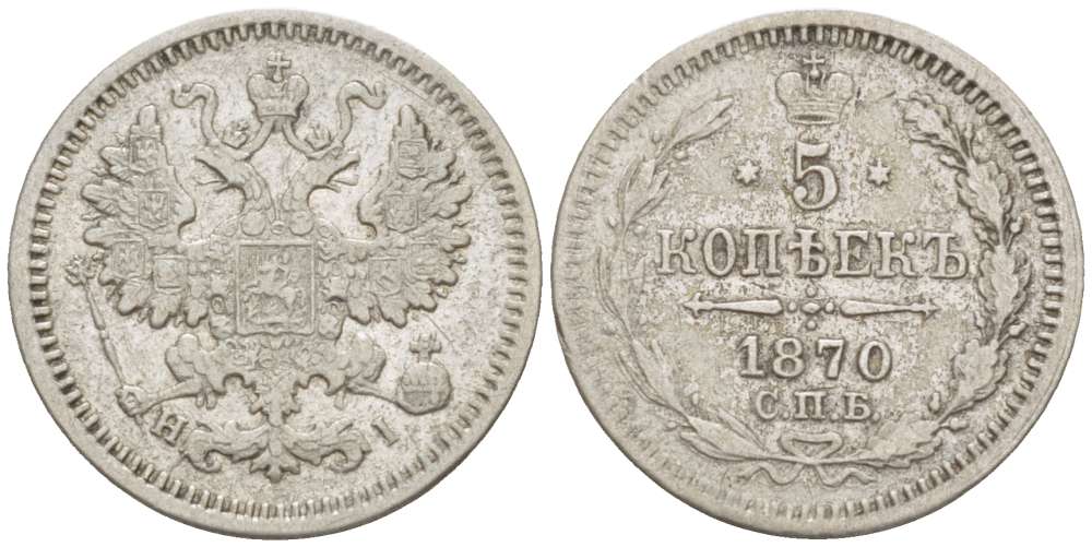 РОССИЯ 5 КОПЕЕК 1870 СПБ-HI, АЛЕКСАНДР II (1855-1881), Биткин 271 KM 19а.1 серебро 155-211