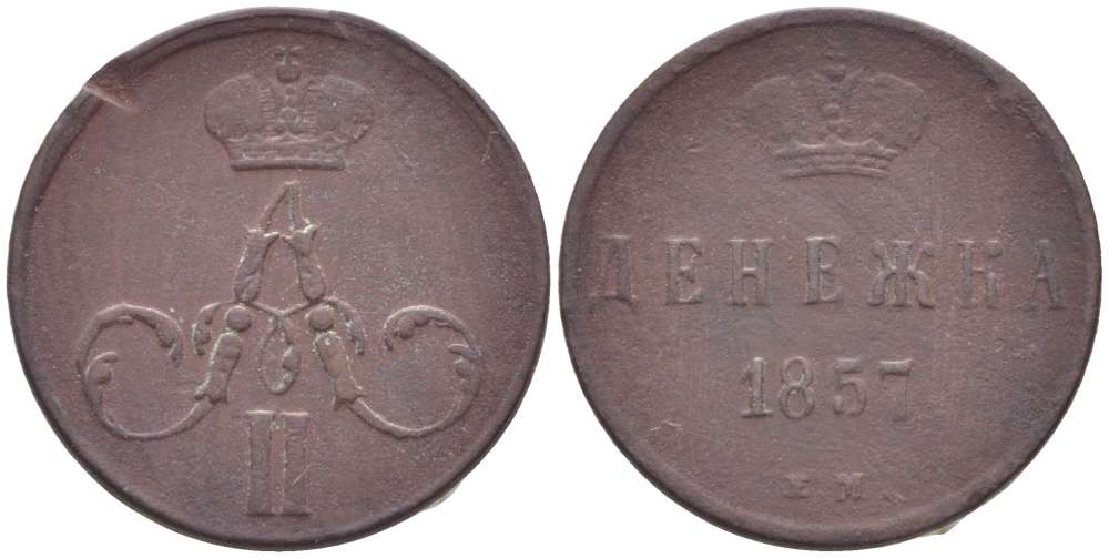 РОССИЯ ДЕНЕЖКА 1857 ЕМ, АЛЕКСАНДР II (1855-1881), Биткин 365 KM 2.1 медь 155-126
