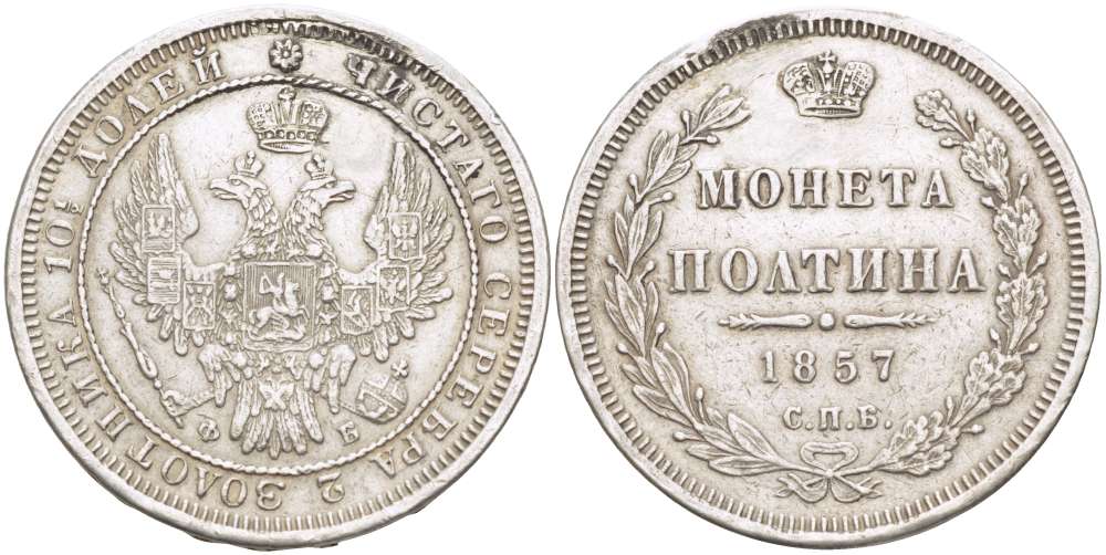 РОССИЯ ПОЛТИНА 1857 СПБ-ФБ, АЛЕКСАНДР II (1855-1881), МОНЕТА С ПОДВЕСКИ , РЕСТАВРАЦИЯ ГУРТА НА 12 ЧАСОВ, Биткин 51 KM 167.1 серебро 155-212