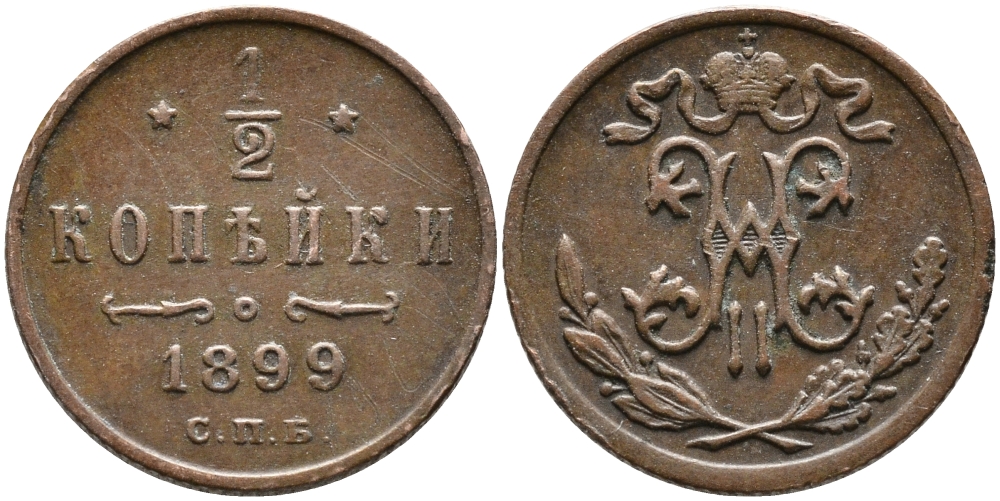 РОССИЯ 1/2 КОПЕЙКИ 1899 СПБ, НИКОЛАЙ II (1894-1917), Биткин 307, ЗАВОД РОЗЕНКРАНЦА В САНКТ-ПЕТЕРБУРГЕ KM 48.1 медь 155-141