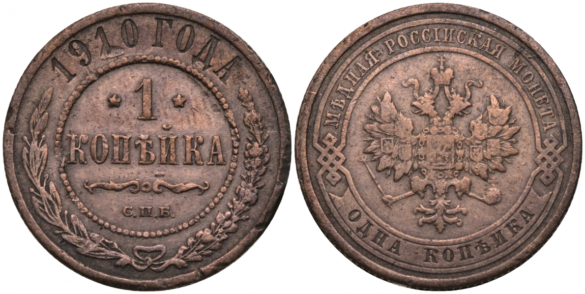 Россия 1 копейка 1910 СПБ, Николай II (1894-1917) Биткин 257, KM 9.2 медь 51-2124
