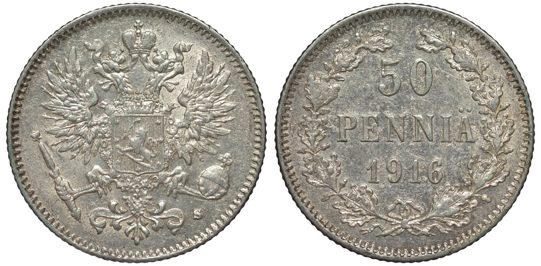 ФИНЛЯНДИЯ 50 ПЕННИ 1916 S KM 2.2 серебро 75-1026