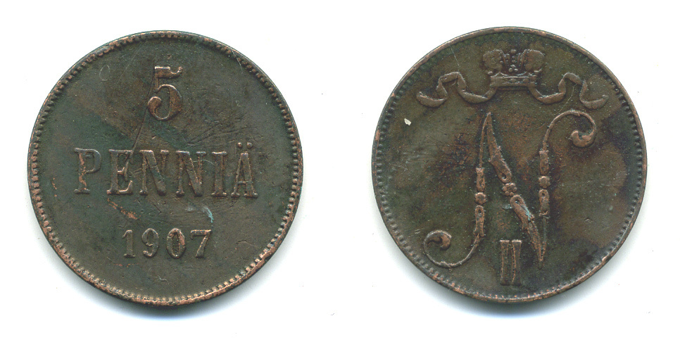 Россия для Финляндии 5 пенни 1907 Николай II (1894-1917) KM 15, Биткин 448 медь 4381-427