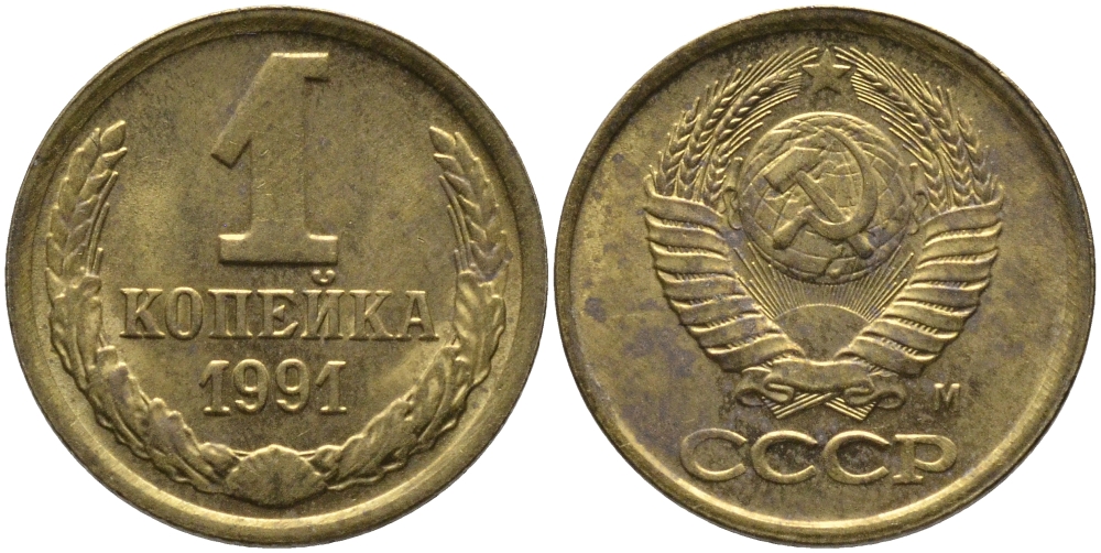 СССР 1 КОПЕЙКА 1991 ММД, БУКВА М KM 126а, Федорин 182 латунь 96-1026