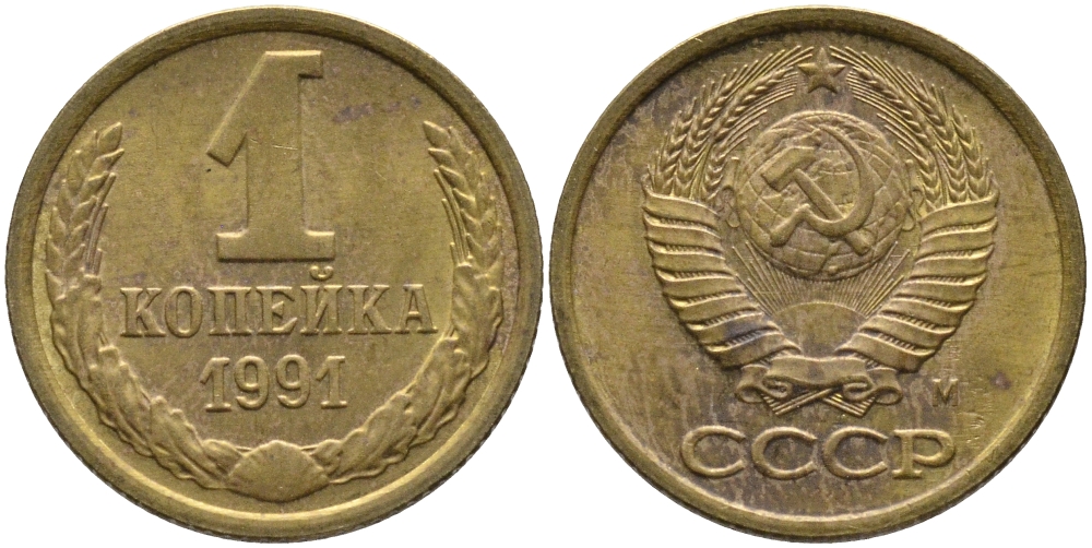 СССР 1 КОПЕЙКА 1991 ММД, БУКВА М KM 126а, Федорин 182 латунь 96-1053
