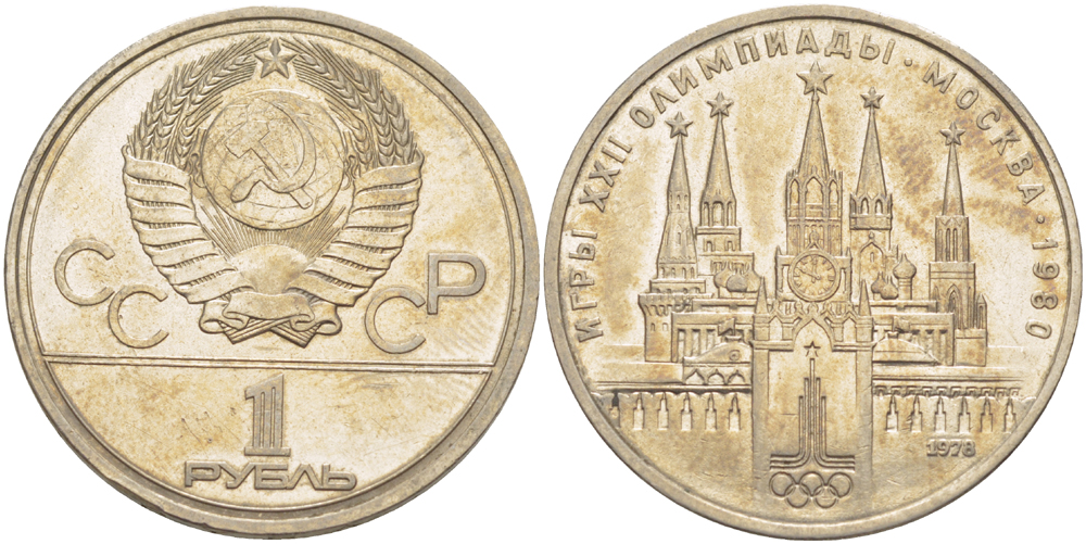 СССР 1 РУБЛЬ 1978 ЛС-ШТ.V.1.2 ОС ШТ.А НА КУРАНТАХ ВМЕСТО ЦИФРЫ IV ОШИБОЧНО ЦИФРА VI, ОЛИМПИАДА 80, МОСКОВСКИЙ КРЕМЛЬ KM 153.2 медь никель цинк 4183-1146