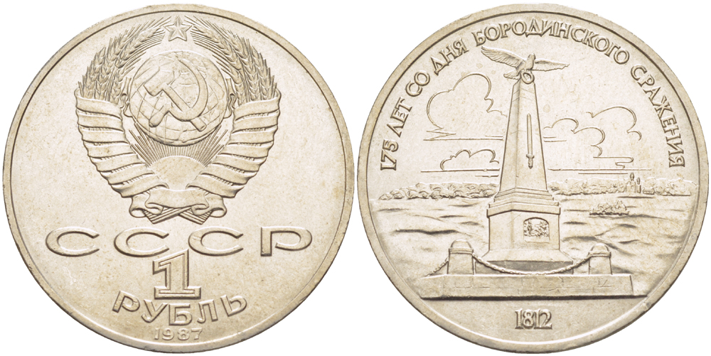 СССР 1 РУБЛЬ 1987 175 ЛЕТ БОРОДИНСКОМУ СРАЖЕНИЮ, ОБЕЛИСК KM 204 медно-никель 4185-422