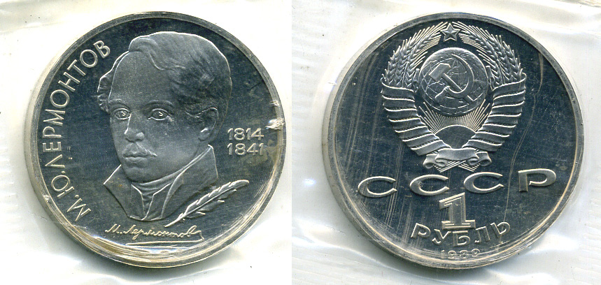 СССР 1 рубль 1989 175 лет со дня рождения М. Ю. Лермонтова (1814-1841) KM 228 медно-никель PROOF M37-1