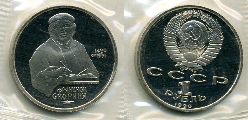 СССР 1 РУБЛЬ 1990 500 ЛЕТ СО ДНЯ РОЖДЕНИЯ ФРАНЦИСКА СКОРИНА (1490-1551), ЗАПАЙКА KM 258 медно-никель PROOF M4-18