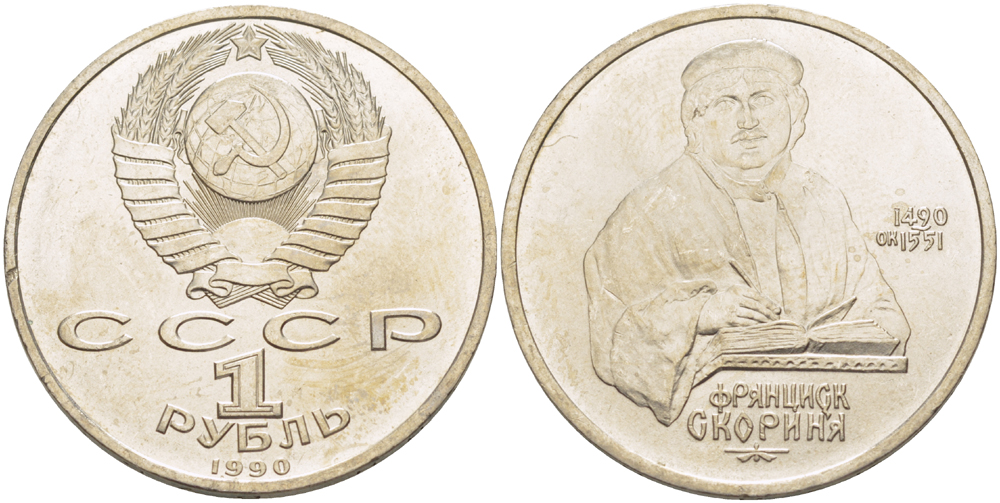 СССР 1 РУБЛЬ 1990 500 ЛЕТ СО ДНЯ РОЖДЕНИЯ ФРАНЦИСКА СКОРИНЫ (1490-1551) KM 258 медно-никель 4183-811