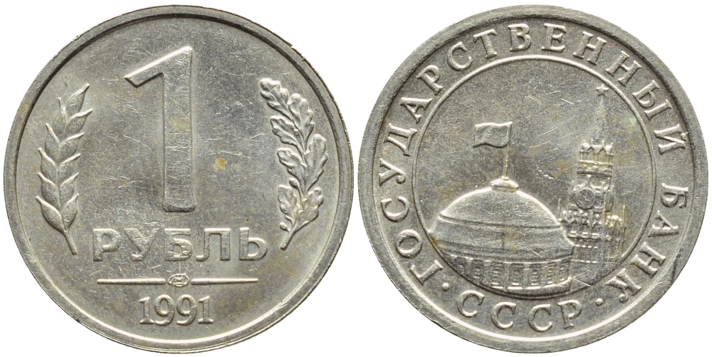 СССР 1 РУБЛЬ 1991 ЛМД, ПОВОРОТ АВЕРСА НА 320 ГРАДУСОВ KM 293 медно-никель 4382-932